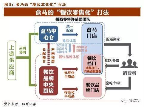 盒馬立足行業(yè)背景提出了餐飲零售化的構想,重新定義餐飲的功能、品類、渠道與消費場景。希望通過拓寬餐飲業(yè)消費場景、加大半成品的比例,打通合作餐飲企業(yè)的中央廚房,以檔口為前置倉,進一步共享物流體系,實現整個餐飲業(yè)的模式迭代與效率升級;