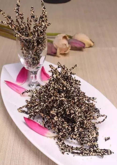 此菜將藕切成細(xì)絲,裹上芝麻炸至酥香,外形酷似麻糖,做法新穎,心思巧妙,推出后熱賣至今,引來(lái)眾多同行爭(zhēng)相效仿。
