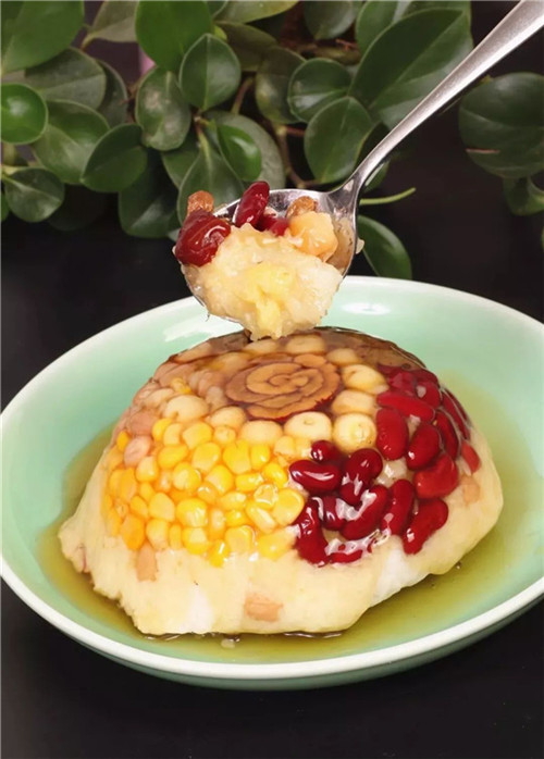 將紅棗去核后卷在一起,從中間橫切一刀,截面朝下置于墊有一層保鮮膜的碗底,外圈放上蓮子25克,四周分別擺入花生米、粘玉米粒、葡萄干各50克以及成品紅腰豆50克,填入一半拌好白糖的糯米,加泰國金枕榴蓮肉150克,再放上剩下的糯米,入蒸箱旺火足汽蒸30分鐘,取出后扣到圓盤中,表面澆一層蜜汁即可走菜。