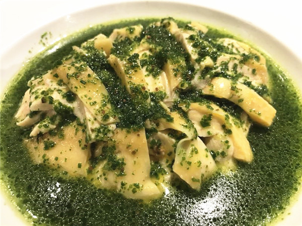 1、雞腿洗凈,入湯鍋煮至剛熟撈起,自然放涼,瀝干水,斜片成雞片,保持雞皮的完整,取三兩(150克)盛入盤中。