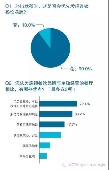 市場上有眾多的連鎖餐飲品牌,也有很多單獨經(jīng)營的餐廳,當(dāng)把兩者放在一起讓消費者選擇時,有高達(dá)90.0%的消費者表示會優(yōu)先考慮連鎖餐飲品牌,優(yōu)勢十分明顯(Q1)。而在進(jìn)一步調(diào)查出現(xiàn)這種巨大差異的原因時,72.4%的消費者選擇了“門店數(shù)量多,可以根據(jù)所在地就近選擇”,63.2%的消費者選擇了“服務(wù)與管理更加規(guī)范”,還有47.7%的消費者選擇了“菜肴口味有保證”(Q2)。由此可以看出,隨著人們的餐飲消費觀念逐步改變,外出就餐時,廣大消費者更加追求品牌質(zhì)量以及方便快捷,所以,用餐更方便、服務(wù)管理和菜肴更規(guī)范便成為了消費者選擇連鎖餐飲品牌的主要原因。