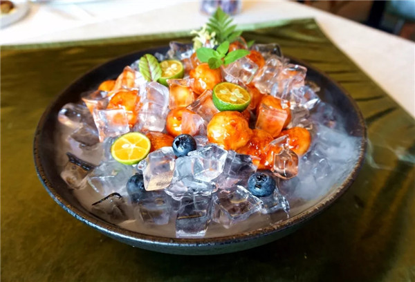 上菜的容器也暗藏玄機,底部是鏤空的,用以瀉水,因此覆冰滿滿也不用擔心菜品變得潮濕軟化,再搭配各色水果,在視覺效果上更為吸引。