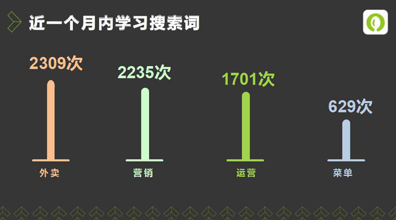 紅利期過后拼的就是內(nèi)功。我在準(zhǔn)備這次PPT之前,讓后臺跑了一下數(shù)據(jù),我們后臺的學(xué)習(xí)用戶有10萬多。過去一個(gè)月最重要的四個(gè)搜索詞,也就是今天在座老板都關(guān)注什么?外賣、營銷、運(yùn)營、菜單是我們老板搜索的課程。這四個(gè)詞是最關(guān)鍵的搜索詞。我們引流過來最重要的一個(gè)關(guān)鍵詞就是外賣,我們的外賣課報(bào)名也還不錯(cuò),這是一個(gè)數(shù)字。再一個(gè)例子,周四全天在我們平臺上學(xué)習(xí)的用戶的情況,我們發(fā)現(xiàn)北京當(dāng)天學(xué)習(xí)用戶最多,廣東其次,其次是江蘇和上海。