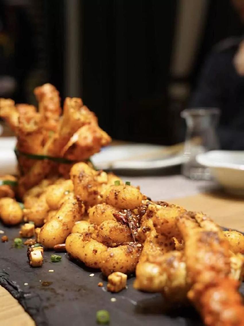 川菜中有一道菜叫做椒麻雞,雞肉煮熟晾涼以后切塊,用刀口花椒和小蔥剁細呈膏狀,再沖入菜籽油以及鹽、糖、醋等調(diào)味料涼拌而成。這道菜是川菜中椒麻味型的代表作。但是這道菜本身也有短板:雞肉切成塊狀之后中間的部分很難入味、大量的油為身體帶來負擔(dān)容易使人感到膩。那么新式川味應(yīng)該如何演繹這道傳統(tǒng)川菜呢?成都銀芭餐廳這樣做:雞肉煮熟后片成片擺成花狀,底部綠色醬汁為椒麻汁,保留了傳統(tǒng)的椒麻香,頂部紅色的醬汁為特制魚香汁,再配以新鮮的竹筍泡菜和小番茄。這樣做不僅擺盤上面顛覆了人們對椒麻雞的認識,并且雞肉從塊狀改為片狀更容易入味,醬汁中少油對身體帶來更小的負擔(dān),搭配的竹筍泡菜能解膩,小番茄能清口,這樣做還能增加這道菜的層次感與美感。這道菜我不敢將他歸類為川菜,但是吃到的卻是地道的川味。