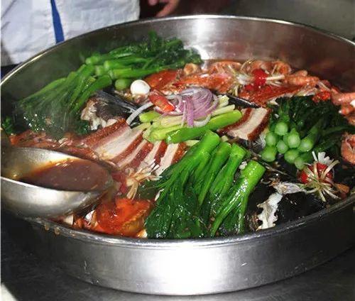 此菜為廣東“順德盆菜”的一種,以3千克重的胖頭魚(yú)為主料,搭配花蟹、明蝦、臘肉、燒肉及順德頭菜一同入盤(pán),蒸透后澆入燒開(kāi)的醬汁,手法簡(jiǎn)練,操作方便,主輔料的鮮美相互融合,滋味濃郁。一盆菜里薈萃百味、包羅萬(wàn)象,有“十全十美”“團(tuán)團(tuán)圓圓”“盆滿缽滿生意興隆”的美好寓意。