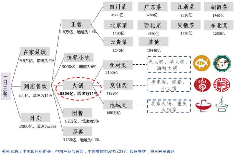 據(jù)全球知名市場調(diào)研機構(gòu)沙利文 (Frost & Sullivan)的調(diào)查報告,2017年,在所有中式餐飲品類中,火鍋的占比是最高的,達(dá)到13.7%。