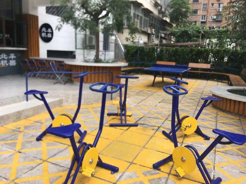 開在胡同里的北鑼鼓巷店,面積約45平,店門外有一個80多平的院子。院子被張一芃改造成了公共空間,有乒乓球臺、有健身器材、有長椅,還種上了石榴、龍抓槐、榆樹等北京四合院的傳統(tǒng)樹種。
