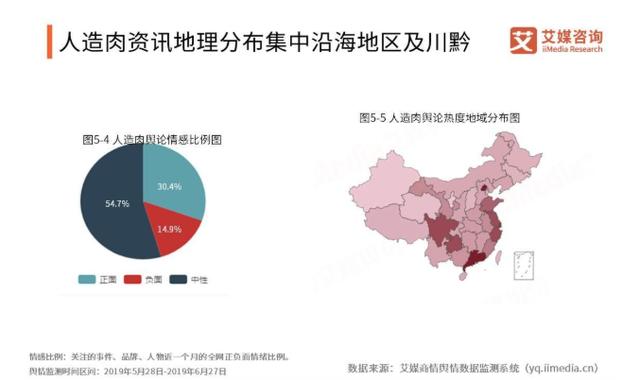 艾媒商情輿情數(shù)據(jù)監(jiān)測系統(tǒng)數(shù)據(jù)顯示,系統(tǒng)監(jiān)測期間“人造肉” 的媒體輿論情感中正面情感評價(jià)和中性情感評價(jià)占比較高,總體媒體情感呈正面和中性。 “人造肉”全網(wǎng)媒體資訊的地理分布主要集中在沿海地區(qū)及川黔兩地,其中北京市和廣東省、香港輿論熱度最高。