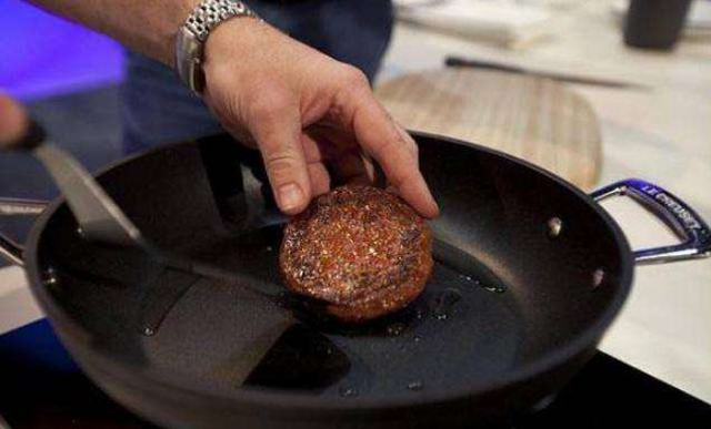 金字公司的工作人員,現場為大家制作了牛肉味植物肉餅漢堡,供大家品嘗。金字牛肉味植物肉餅呈圓形,厚度比常見牛排略厚;顏色鮮紅,與新鮮牛肉相近。因為植物肉餅是冷凍保存的,烹飪前需要先解凍。工作人員將解凍后的肉餅放入煎鍋用油煎熟,煎的時間一般5到10分鐘。在煎的過程中飄來陣陣濃郁的肉香。