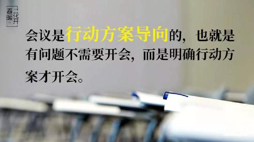 正確的做法是,會(huì)議是行動(dòng)方案導(dǎo)向的,也就是有問題不需要開會(huì),而是明確行動(dòng)方案才開會(huì)。 因?yàn)?,討論問題的會(huì)議是很難達(dá)成共識(shí)的,同時(shí)會(huì)耗費(fèi)時(shí)間,需要多人參與,這對(duì)解決問題而言,不是最好的解決方式。要知道,理解和判斷問題應(yīng)該是回到問題發(fā)生地,而不是在會(huì)議室,所以會(huì)議對(duì)于問題而言,不是最好的解決路徑。