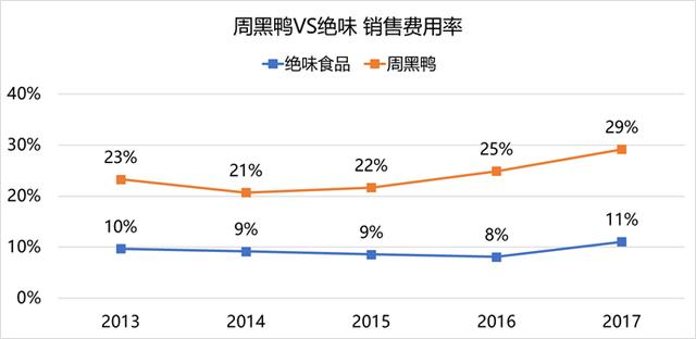 從費用占比來看,周黑鴨的銷售費用占收入比例高達20%左右,而絕味的銷售費用占收入的比例不到10%。