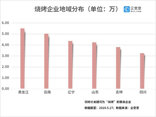 企查查數(shù)據(jù)顯示,,我國共有燒烤相關(guān)企業(yè)60.37萬家,其中企業(yè)狀態(tài)為在業(yè)/存續(xù)的共39.16萬家。從區(qū)域分布來看,黑龍江是我國燒烤消費大省,共5.5萬家企業(yè)排名第一,占所有燒烤企業(yè)總數(shù)的9.2%。
