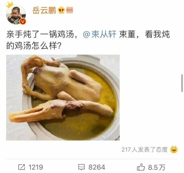 第二幕: 晚上八點,岳云鵬發(fā)文配雞(鴨)湯call束從軒,#岳云鵬指鴨為雞#成了當晚微博最熱的話題之一。