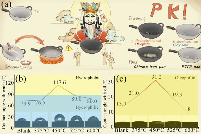 (a)中華鑄鐵鍋開鍋過程。通過反復(fù)幾次的“涂抹動物油-灼燒”過程,鐵鍋將被賦予親油疏水的特性,相比“疏油疏水”的不粘鍋,更容易實(shí)現(xiàn)對食材的均勻加熱;(b)經(jīng)過450℃開鍋處理的鐵鍋與水的接觸角增至117.6°,實(shí)現(xiàn)疏水效果;(c)不同溫度的開鍋都能夠保證鐵鍋表面優(yōu)秀的親油性 。