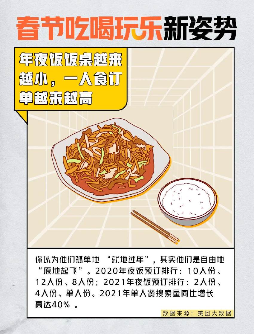 與線下年夜飯講究人多熱鬧不同,線上年夜飯更強(qiáng)調(diào)“小而美”。作為“原年人”的第一個(gè)春節(jié),單人餐成為今年除夕的消費(fèi)熱點(diǎn),據(jù)悉,北京“一人食”年夜飯訂單量占比增幅384%,可見其火爆程度。