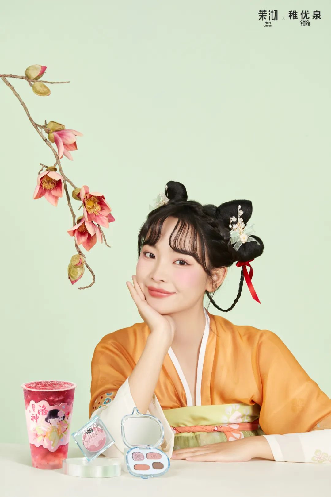 圍繞本次上新,茉沏也與稚優(yōu)泉進(jìn)行了聯(lián)名,并打出了“‘稚’此‘茉沏’時(shí),共賦洛神色”的概念。