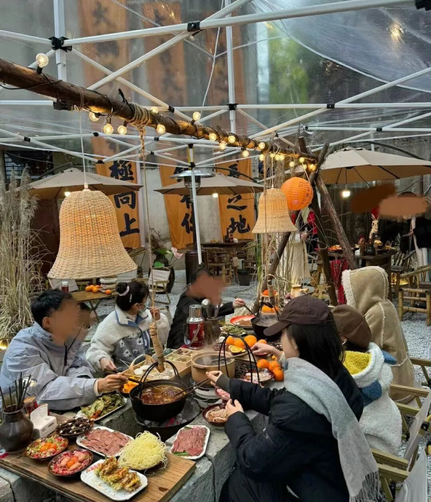 它和圍爐煮茶一樣,主打氛圍感,鍋具被粗麻繩吊在半空,石塊或紅磚還原火塘造型,上面擺放著各式配菜,再搭配上露營(yíng)風(fēng)格的裝飾、暖黃的氛圍燈,滿滿的閑適、野性感就出來了。